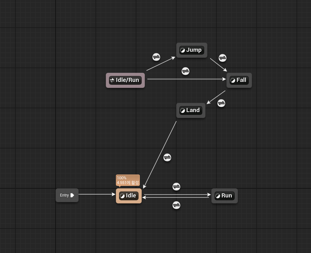 스테이트 매쉬를 이용해 만든 캐릭터의 기본자세,걷기,달리기,점프,착지를 구현한 모습이다.